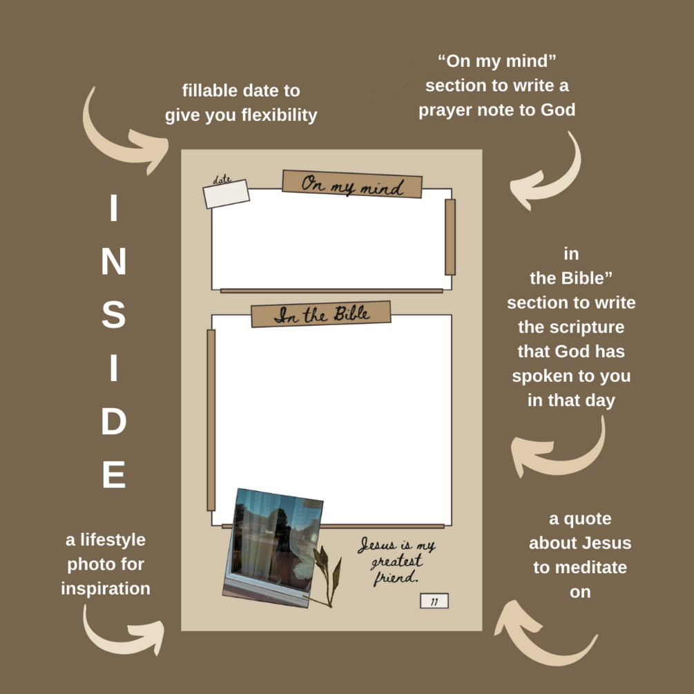 Please note that “What’s On My Mind” and “In The Bible” sections are completely fillable, so it’s up to you to fill it with what you prayed to God and read in the Bible each day. I provide the diary and inspo, but you have to put in the effort and work everyday to make this work!Jesus is as close to you as you allow Him to be. So, allow him to walk side by side with you in this 40 day spiritual journey and every day after.