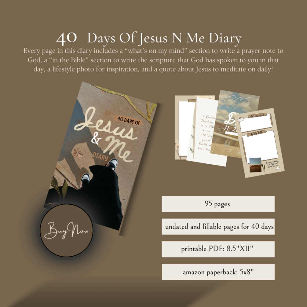 40 days of Jesus & Me Diary includes 90 fillable pages to help you embark on a journey of walking with Jesus for 40 days.