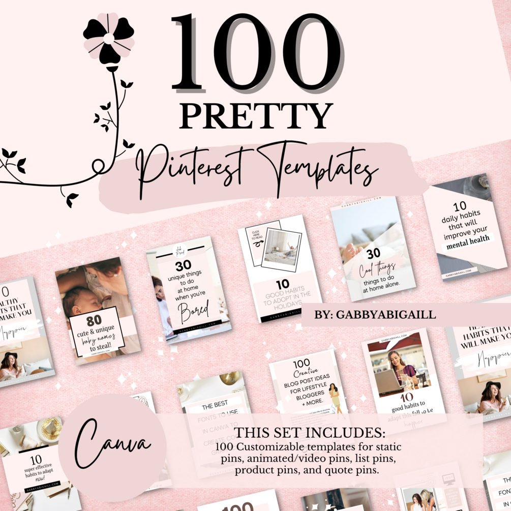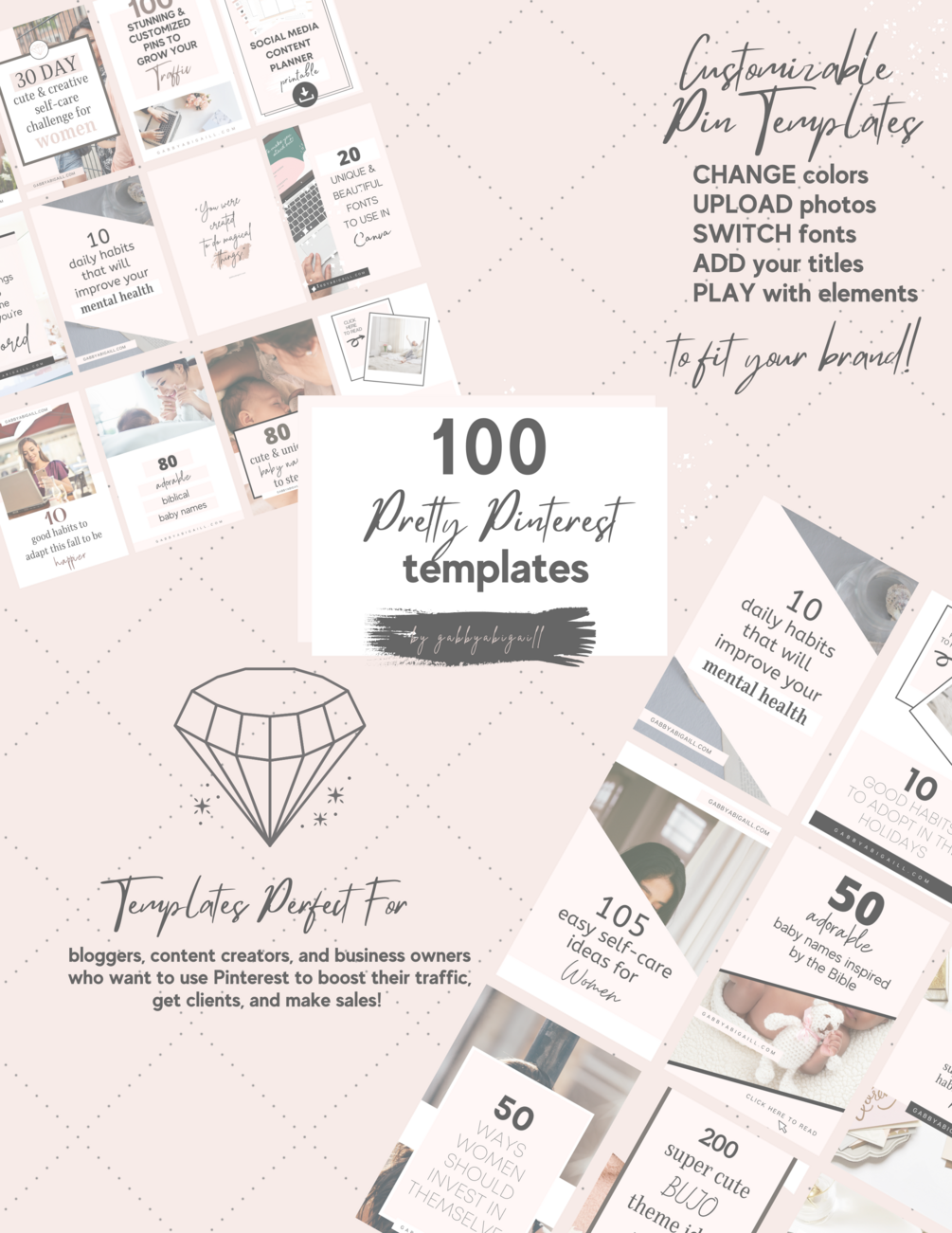 100 easily customizable (on Canva) Pinterest templates. You can change the colors to fit your brand, easily upload photos into the templates, add your logo/url, play around with the fonts & elements, and customize all 100 templates to your liking.