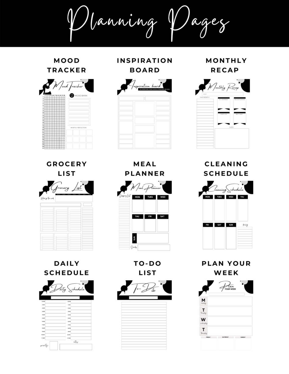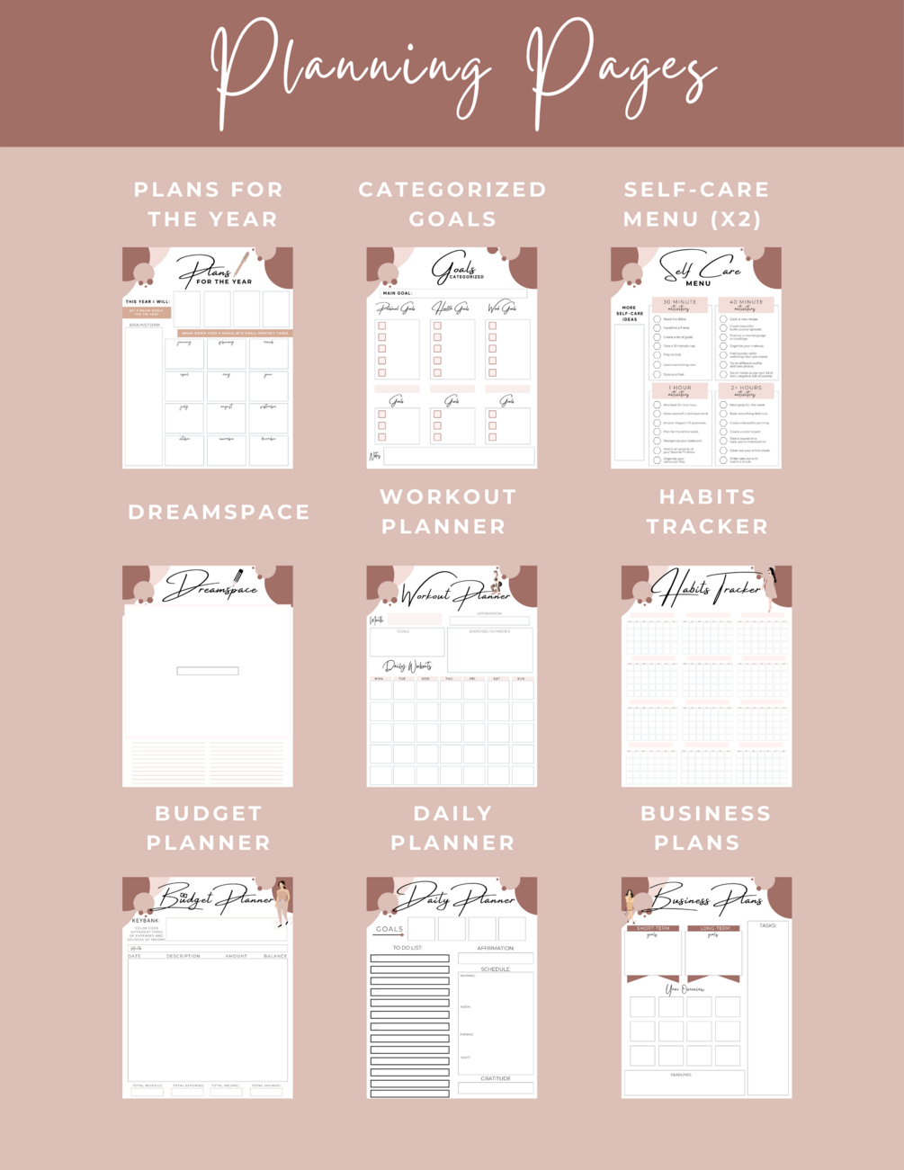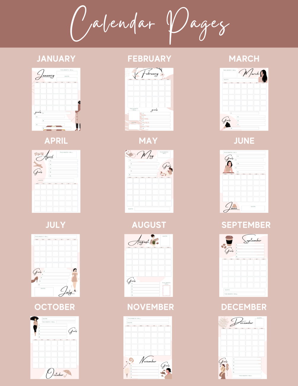 On top of getting 12 customized calendar pages, you will get the following printables to help you plan different areas in your life: