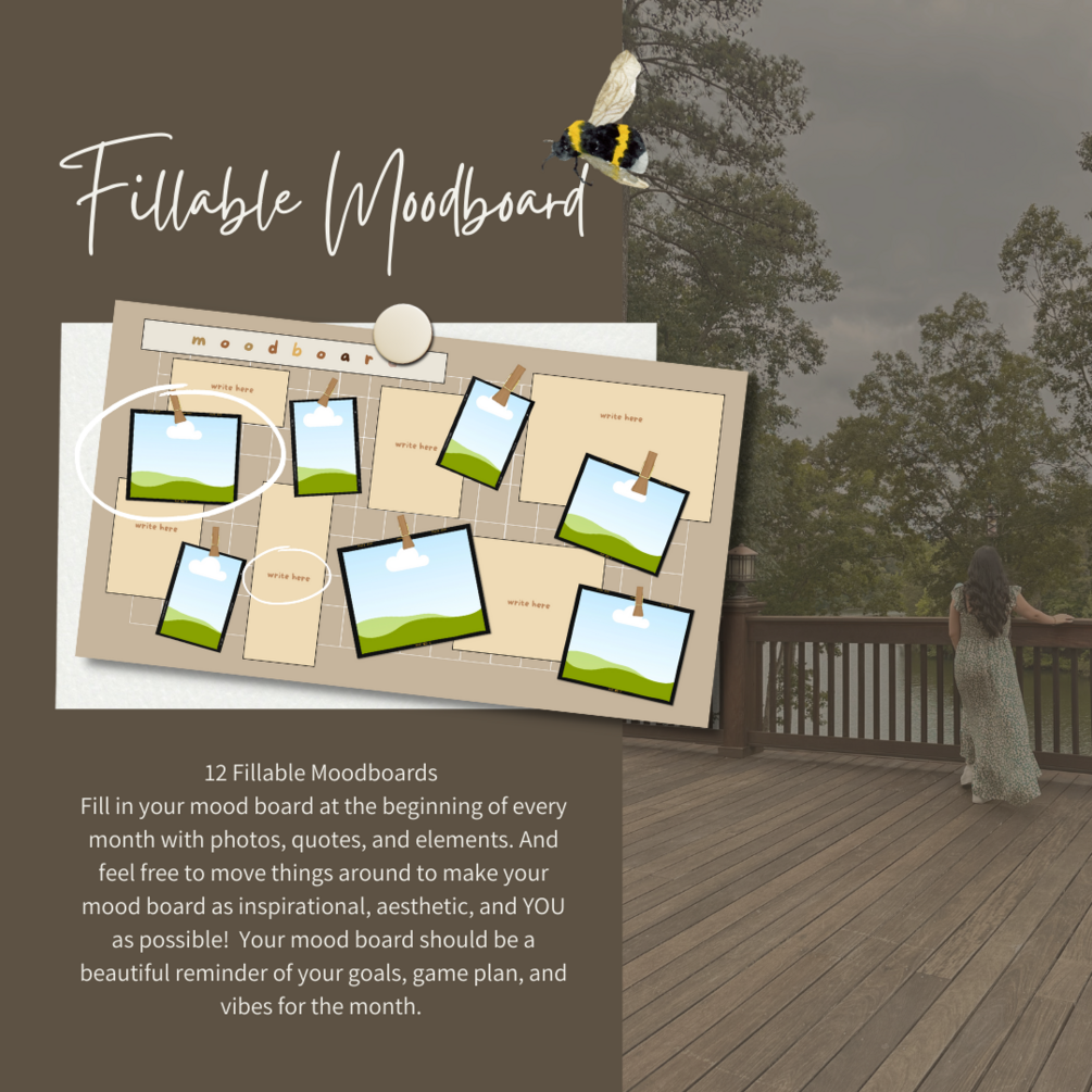 Fill in your mood board at the beginning of every month with photos, quotes, and elements. And feel free to move things around to make your mood board as inspirational, aesthetic, and YOU as possible! Your mood board should be a beautiful reminder of your goals, game plan, and vibes for the month.
