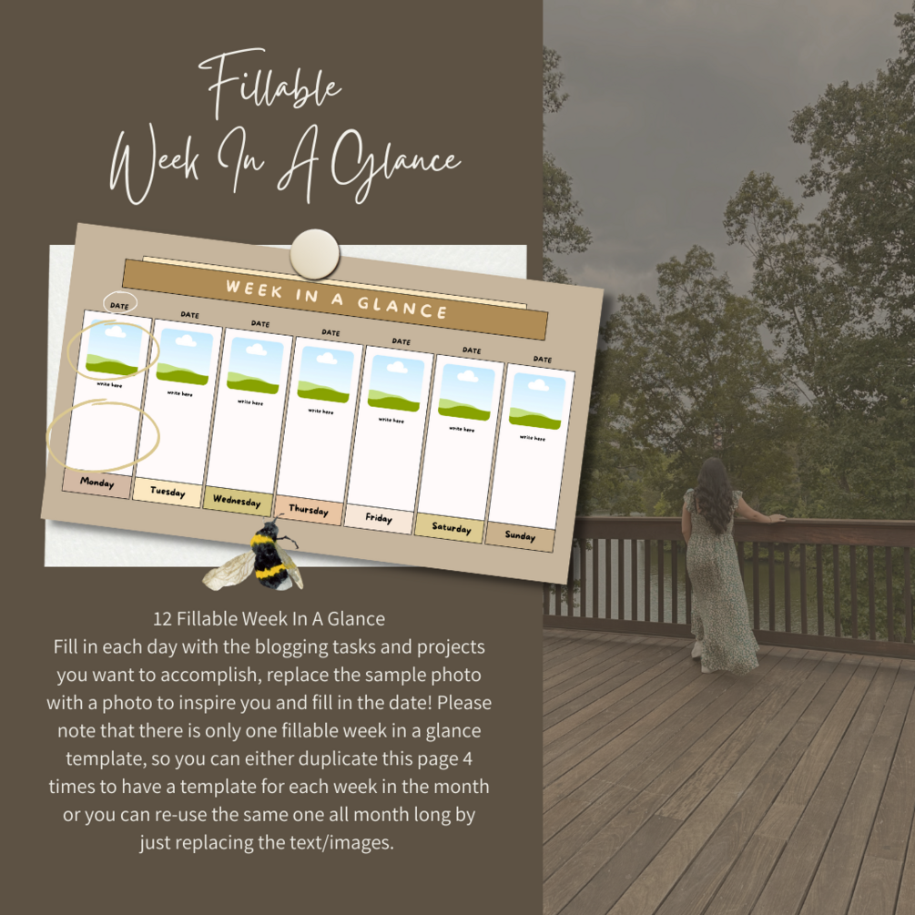 Fill in each day with the blogging tasks and projects you want to accomplish, replace the sample photo with a photo to inspire you and fill in the date! Please note that there is only one fillable week in a glance template, so you can either duplicate this page 4 times to have a template for each week in the month or you can re-use the same one all month long by just replacing the text/images.
