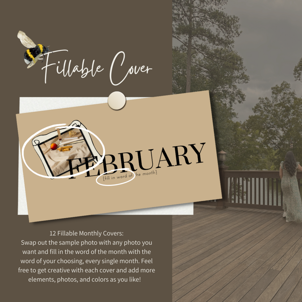 Swap out the sample photo with any photo you want and fill in the word of the month with the word of your choosing, every single month. Feel free to get creative with each cover and add more elements, photos, and colors as you like!