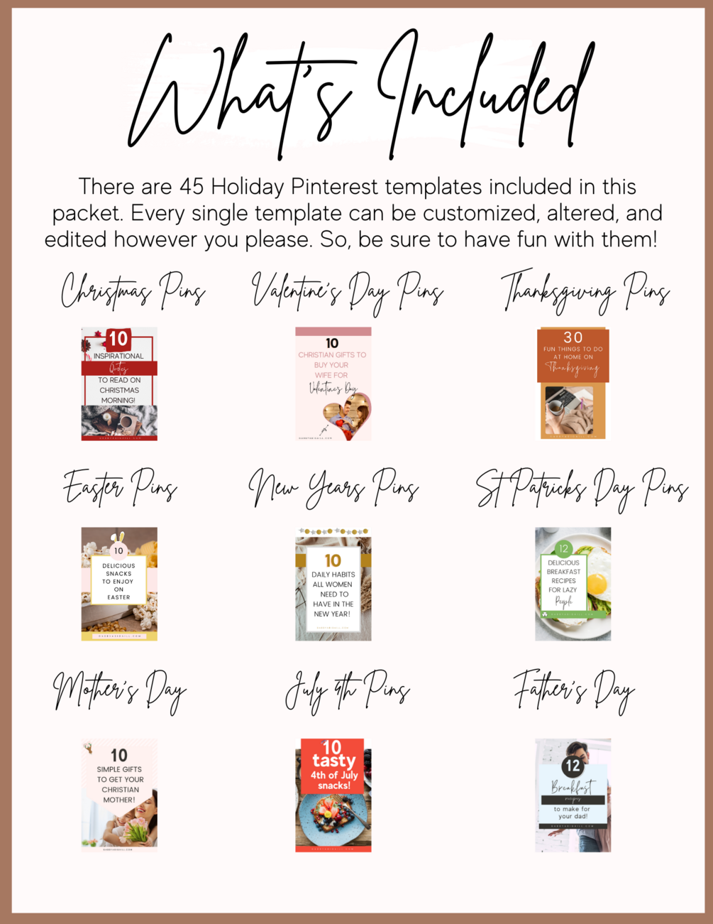 45 customizable (on Canva) Holiday Pinterest templates. You can change the colors to fit your brand, easily upload photos into the templates, add your logo/url, play around with the fonts & elements, and customize all 45 templates to your liking.