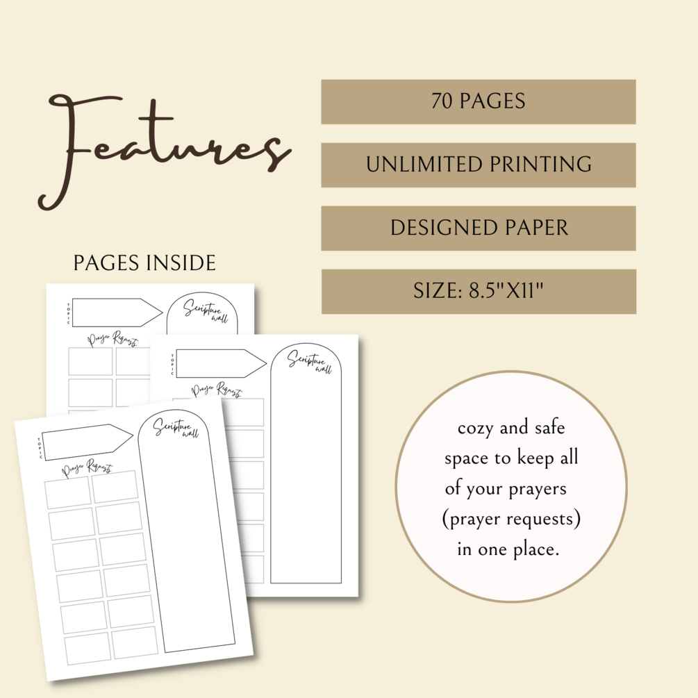 Pray Fervently is the ultimate christian journal to inspire, help, and support you in your prayer journey. These carefully designed pages will give you a cozy and safe space to keep your prayers all in one place. Each page is designed to help you categorize different prayer topics, write down prayer requests related to those specific topics, and each page also includes a "scripture wall" where you can write down bible verses related to the topic to help you pray with scripture.