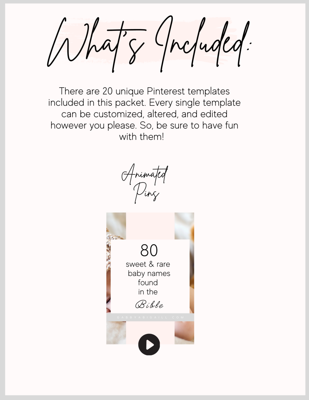 Upon purchase you will receive a PDF file that includes the links to all 20 animated pinterest templates on Canva, clear instructions on how to use them, and a "thank you" surprise from me to you!